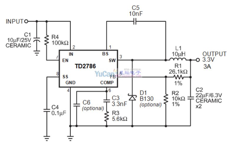 TD2786是同步整流降壓調(diào)節(jié)器。該器件集成了功率MOS 可提供3A負載連續(xù)電流,輸入電壓在4.75V - 32V之間。電流模式控制提供快速瞬態(tài)響應和逐周期電流限制。軟啟動可防止在開機時涌流,在關機模式下,電源電流降至1uA。在PSM/PWM模式下,TD2786根據(jù)輸出電流來調(diào)節(jié),以實現(xiàn)從低到滿負載的高效率運行。該芯片采用SOP8-PP封裝,它提供了一個具有最小外部組件的非常緊湊的解決方案。